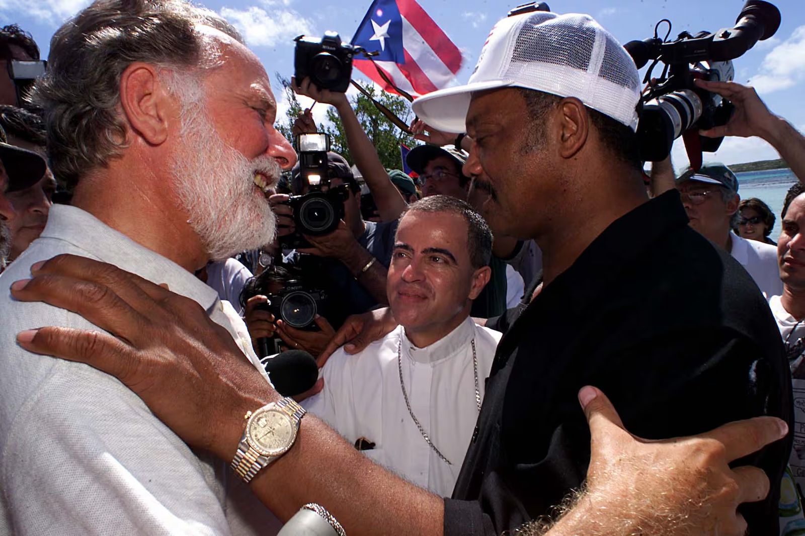 Jesse Jackson visitó a Rubén Berríos en su campamento de protesta en Vieques, durante las protestas de 1999 en contra de las maniobras militares.